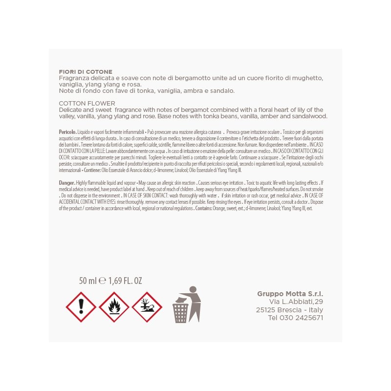 FIORI DI COTONE Fragranza delicata e soave con note di bergamotto unite ad un cuore fiorito di mughetto, vaniglia, ylang ylang e rosa. Note di fondo con fave di tonka, vaniglia, ambra e sandalo.